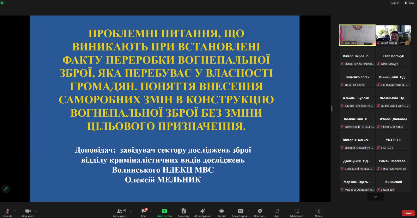 На запрошення організаторів семінару онлайн участь у його роботі від Львівського НДЕКЦ МВС взяв судовий експерт сектора досліджень зброї відділу криміналістичних видів досліджень Андрій Єдинак, який виступив з доповіддю «Дослідження особливостей конструкції переробленої зброї»